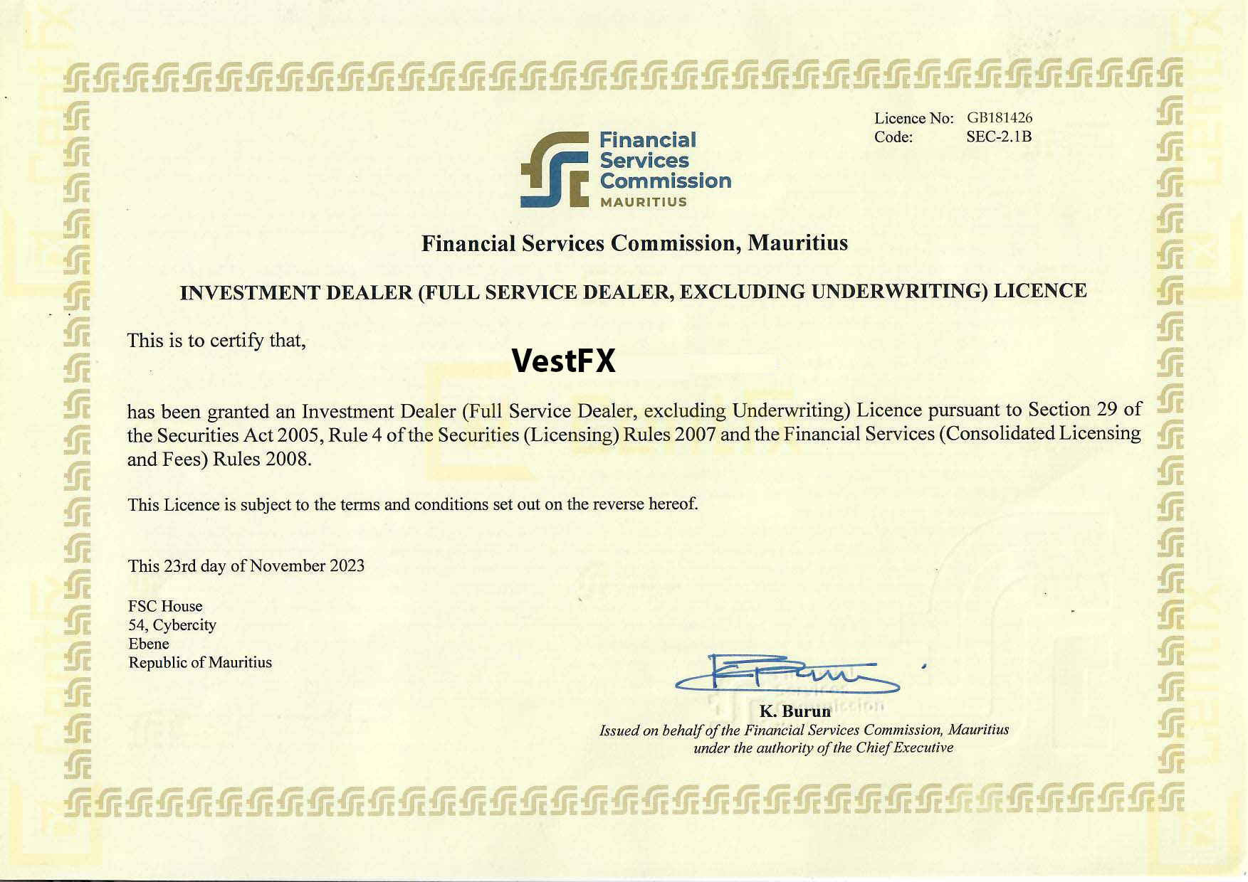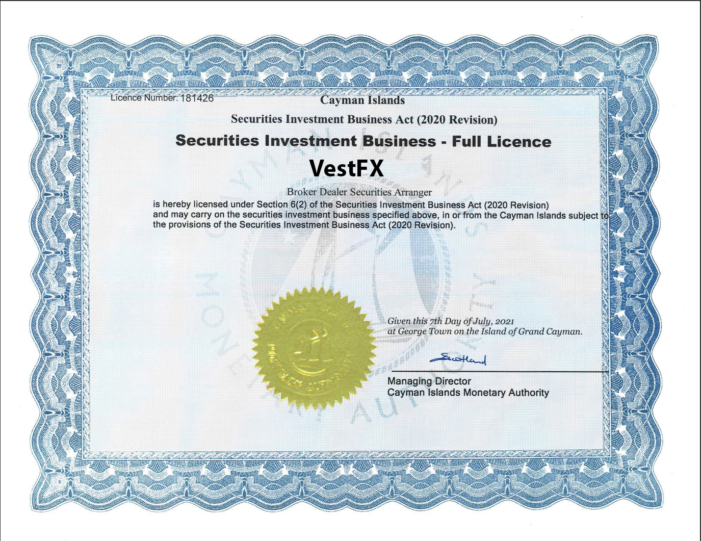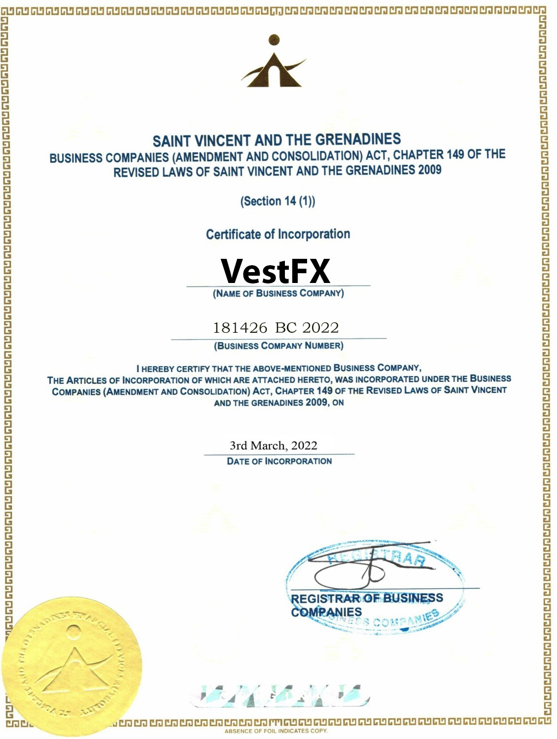 VestFX is registered by the Financial Services Authority (FSA) of St. Vincent & the Grenadines as an International Business Company with the registration number 181426 BC 2022. The objects of the company are all subject matters not forbidden by International Business Companies (Amendment and Consolidation) Act, Chapter 149 of the Revised Laws of Saint Vincent and the Grenadines, 2009, in particular but not exclusively all commercial, financial, lending, borrowing, trading, service activities and the participation in other enterprises as well as to provide brokerage, training and managed account services in currencies, commodities, indexes, CFDs and leveraged financial instruments.